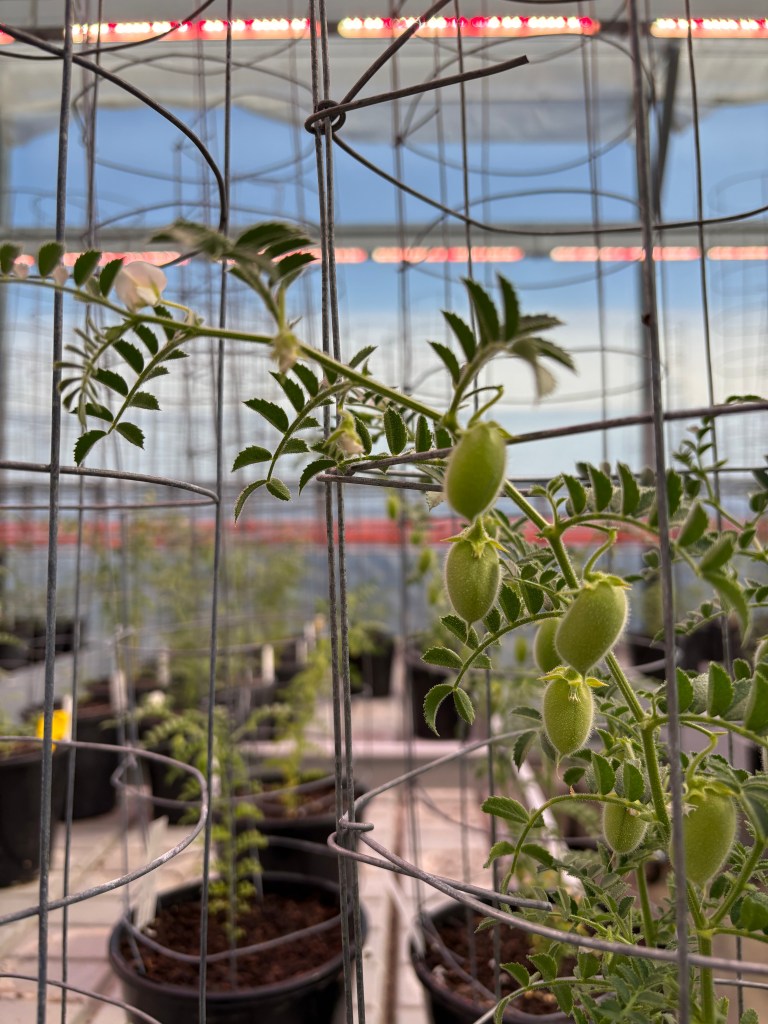 Among the biotic stresses, Ascochyta blight is one of the most devastating diseases of chickpea caused by Ascochyta rabiei, resulting in an estimated AU $4.8 million annual loss to the Australian chickpea industry. To combat this, the breeding team has screened wild relatives and identified resistance in a Cicer reticulatum accession, which has since been introgressed into cultivated lines. These lines are currently being evaluated for resistance under glasshouse conditions using virulent strains, with several lines showing susceptibility, whereas others displaying promising resistance (Top 2 photos).