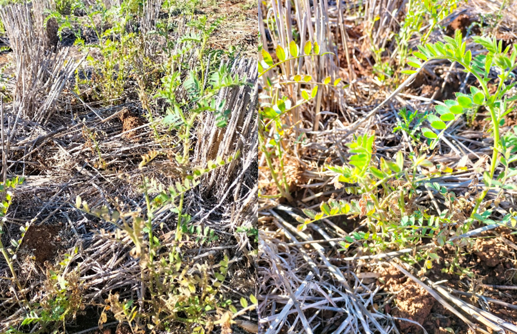 In parallel, cultivated chickpea lines are being tested in the field using previously infected stubble as inoculum, where high susceptibility is still evident (bottom photo).
